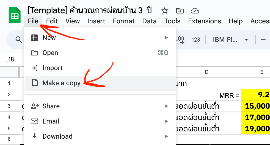 จากนั้นให้คลิกที่ Link เพื่อเข้าสู่ Template แล้วกด File > "Make a copy" ตามรูปด้านล่างได้เลยครับ