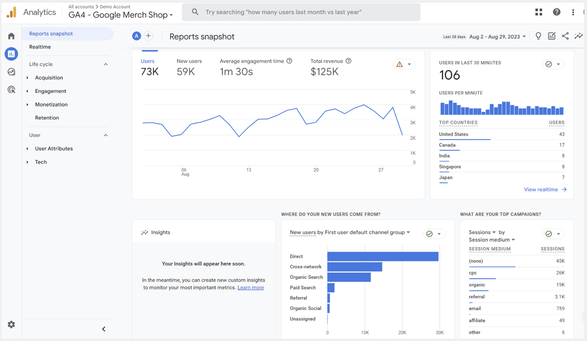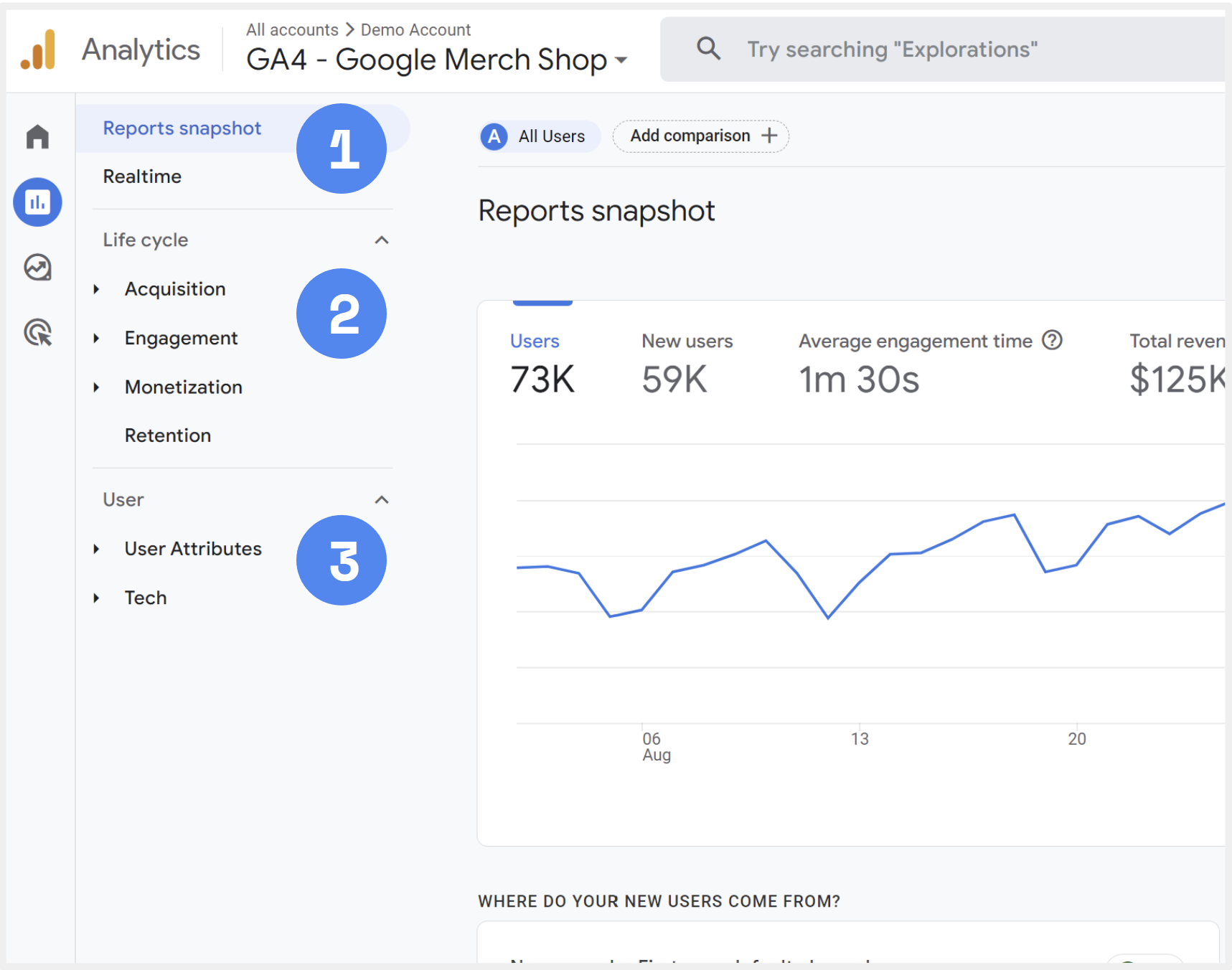 ภาพตัวอย่างที่เราแคปมาให้ทุกคนในบทความนี้ มาจาก Demo Account ของทาง Google ซึ่งที่จริงแล้วทุกคนสามารถลองเข้าไปเล่น Google Analytics (GA4) ผ่าน Demo Account ได้ เพียงแค่มีสองสิ่ง คือ