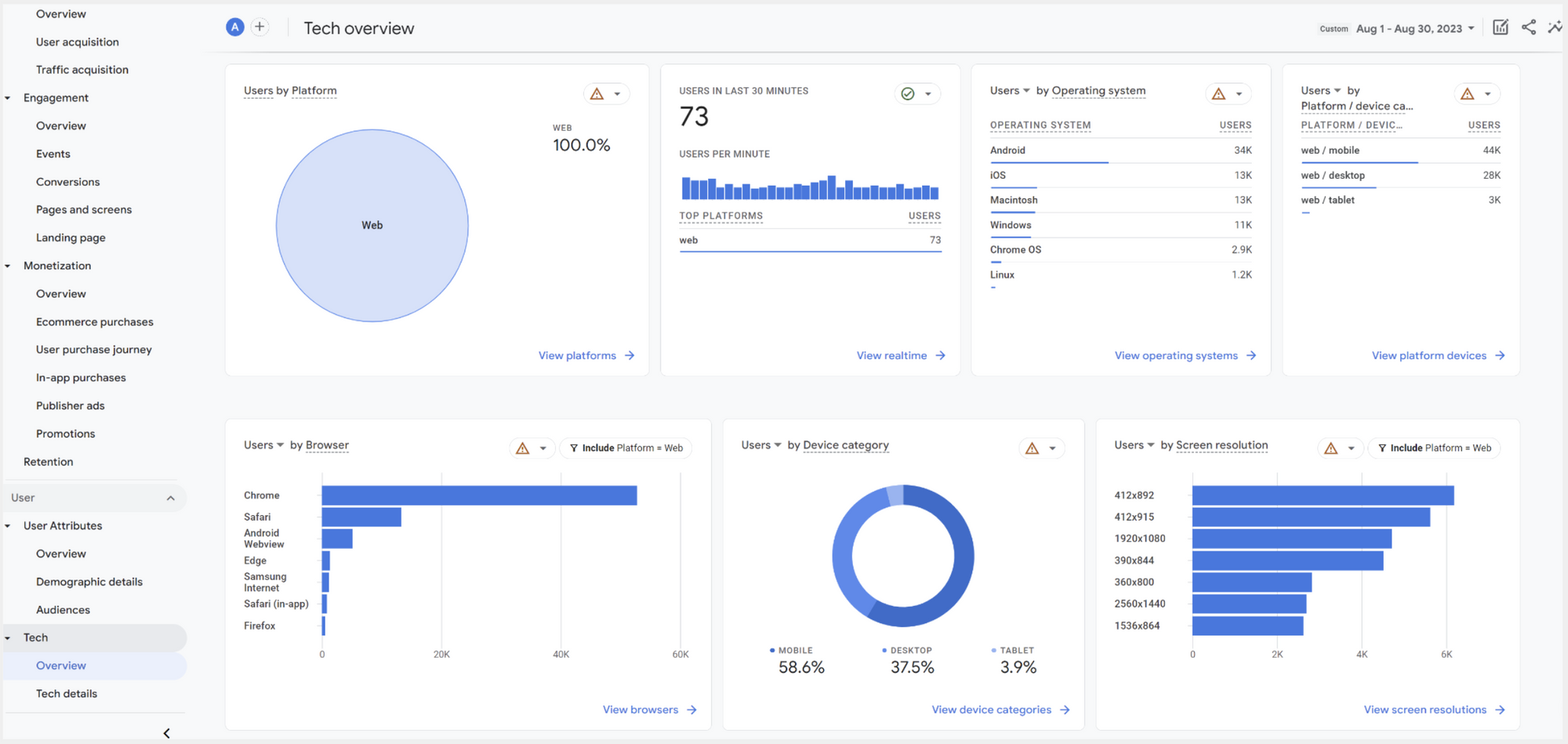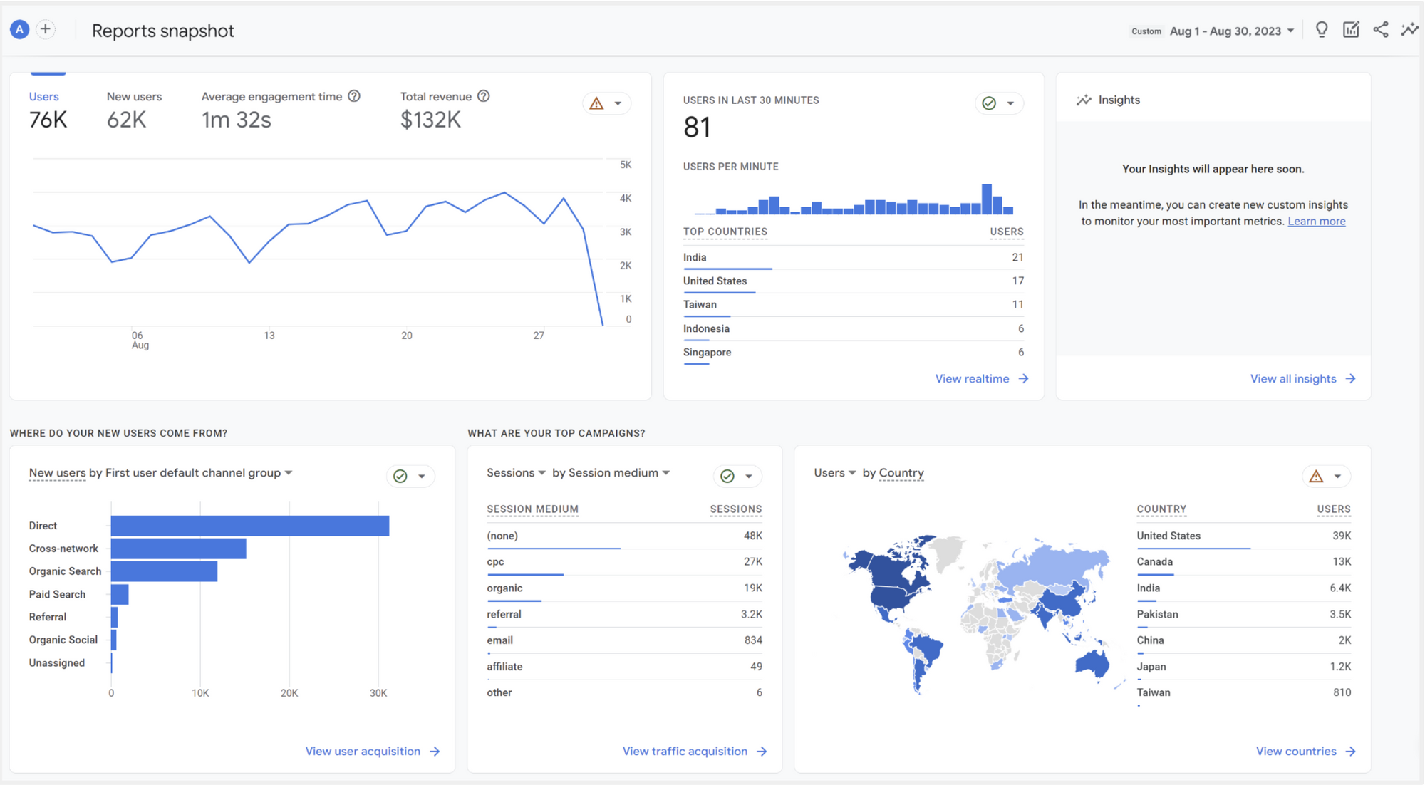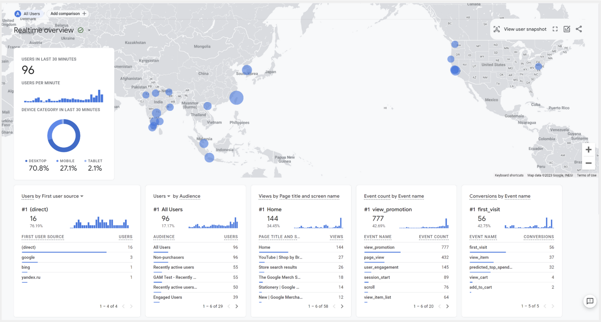 Realtime แสดงผลข้อมูลพฤติกรรมของผู้ใช้งาน 30 นาทีล่าสุด ในรูปแบบของแผนที่และสถานที่ตั้ง, ช่องทางที่พาผู้ใช้งาน (Users) เข้ามายัง Website, จำนวน Users, จำนวน Events และ Conversions เรียกได้ว่าถ้าอยากรู้เหตุการณ์ปัจจุบันทันด่วน Report นี้ถือว่าตอบโจทย์เลย
