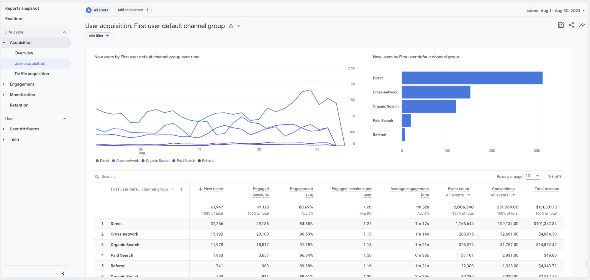 Acquisition เป็น Report ที่ช่วยวัดผลว่ามีช่องทางไหนบ้างที่นำพาผู้ใช้งาน (Users) เข้ามายัง Website ของเรา และประสิทธิภาพของแต่ละช่องทางเป็นอย่างไร โดยดูจาก 3 Dimensions คือ