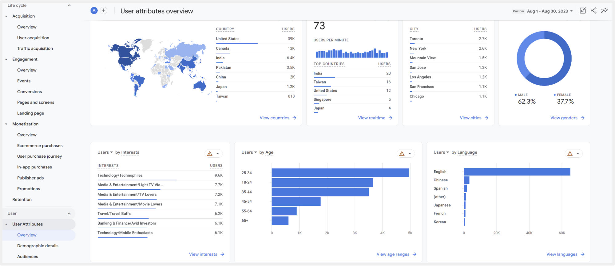 User แสดงข้อมูลเกี่ยวกับผู้ใช้งานเป็นหลัก ใช้ประกอบการวิเคราะห์ควบคู่ไปกับ Report ในกลุ่ม Life Cycle ที่เป็นวงจรชีวิตของ Website มีอยู่ 2 Report ย่อย