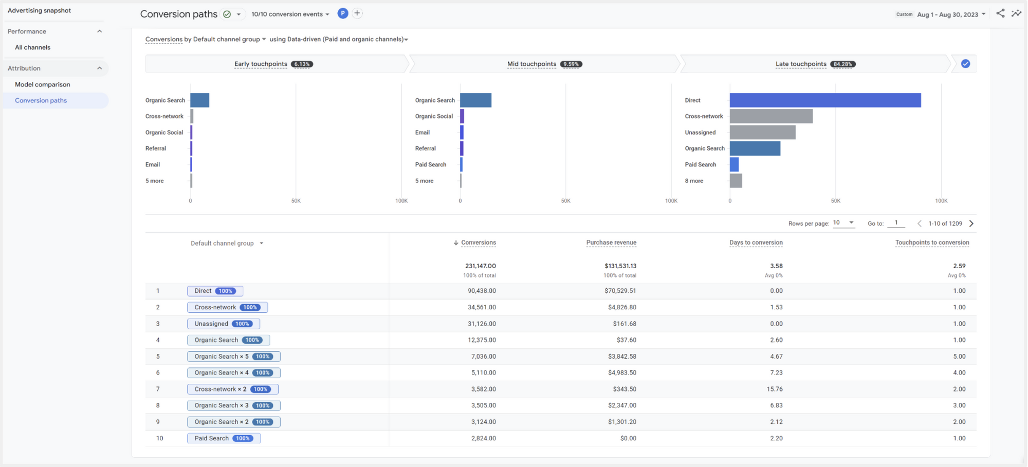 นอกจากนั้นยังมี Conversion Paths เป็น Report ที่ช่วยแสดงผลแต่ละ Touch Point (จุดที่ Users ได้เจอสินค้าหรือบริการของเรา) ว่าจุดไหนมีอิทธิพลให้เกิด Conversions มากที่สุด ตามภาพด้านล่าง